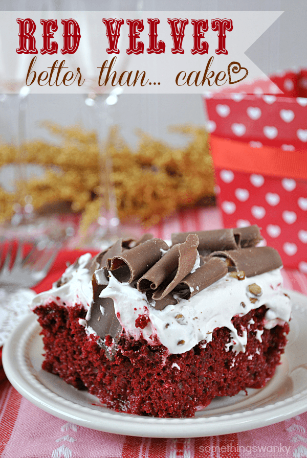 Better Than Valentine’s Day… Red Velvet Poke Cake Recipe posted by Something Swanky Pin Share Tweet Email Jump to Recipe SomethingSwanky is reader-supported. When you buy through links on our site, we may earn an affiliate commission at no extra cost to you. I’m sure you knew this was coming. Between my use of Red Velvet as a Valentine’s Day crutch and my recently developed obsession with poke cakes, this was really always part of the plan, right? But don’t wave it off already! Just like my Christmas Poke Cake, there’s a little more to this one than meets the eye. Yes, yes. It’s saturated in a copious amount of sweetened condensed milk. Yes, it has a whipped topping. And the chocolate and chopped pecans on top aren’t really much of a surprise either, are they? But what you can’t detect just by looking at this cake is that it has some serious Cinnabon flavoring to it! I’ve been looking for a way to incorporate International Delight’s Cinnabon Creamer into a dessert. Because it is completely divine. I’ve been drinking it in my hot chocolate alllllllll winter. Just open the top and take a whiff– it’s like you’re actually walking into a Cinnabon store! And isn’t their smell the best part? (well, almost) Anyway. The creamer doesn’t really have a very strong cinnamon-y taste, so I was having a hard time thinking of ways to use it. Because my mind naturally wanted to take it to a cinnamon-y place. And then it occurred to me: the reason it doesn’t taste like cinnamon is because it tastes like cinnamon roll FROSTING. Which we all know is in a class of it’s own, right?! And I wanted this cake to have that cream cheese flavor to it, since cream cheese and red velvet are a classic pairing, but I couldn’t find a great place to incorporate actual cream cheese without messing up the texture. The Cinnabon creamer ended up being a perfect solution, and I love how the flavor turned out! Eat up! Continue to Content Better Than Valentine’s Day… Red Velvet Poke Cake Print Ingredients 9x13 Red Velvet Cake, baked and cooled 1 - 14.5 oz can sweetened condensed milk 1 cup International Delight Cinnabon creamer, divided 1 - 10.6 oz tub Vanilla Cool Whip Frosting 1 - 8 oz Cool Whip Optional toppings: chocolate shavings and chopped pecans Instructions Use the bottom of a wooden spoon to poke approximately 20 holes evenly over the cake. Whisk together the sweetened condensed milk and 1/2 cup of the creamer. Pour the mixture evenly over the cake, trying to fill the holes as much as possible. In a large bowl, whisk together the cool whip frosting, the cool whip, and the remaining creamer. Spread over top of the cake. Top with chocolate shavings and chopped pecans (amount varies according to preference). Chill for 4-6 hours, overnight is best. Serves 12. Notes about this recipe: My method for making chocolate curls: I took one whole block of almond bark and microwaved it in the package for 20 seconds. Remove from the package and scrape a vegetable peeler down the side of the block. I only went about halfway down the block– otherwise my peeler would break the curl. I found the middle of the block to be the softest, so that’s where I had the best curls. I used a Duncan Hines boxed cake mix for my red velvet cake. A red velvet cake made from scratch would work perfectly too! My favorite from-scratch recipe for red velvet (isn’t on the blog yet!) is by Cake Man Raven. If you google “Cake Man Raven + Red Velvet cake Recipe,” you should be able to find it. Poke Cake from Friends: Gingerbread Butterscotch Better Than… Cake by Crazy For Crust Better Than Anything Oreo Poke Cake by Chef in Training Better Than Anything Cake by Chef in Training