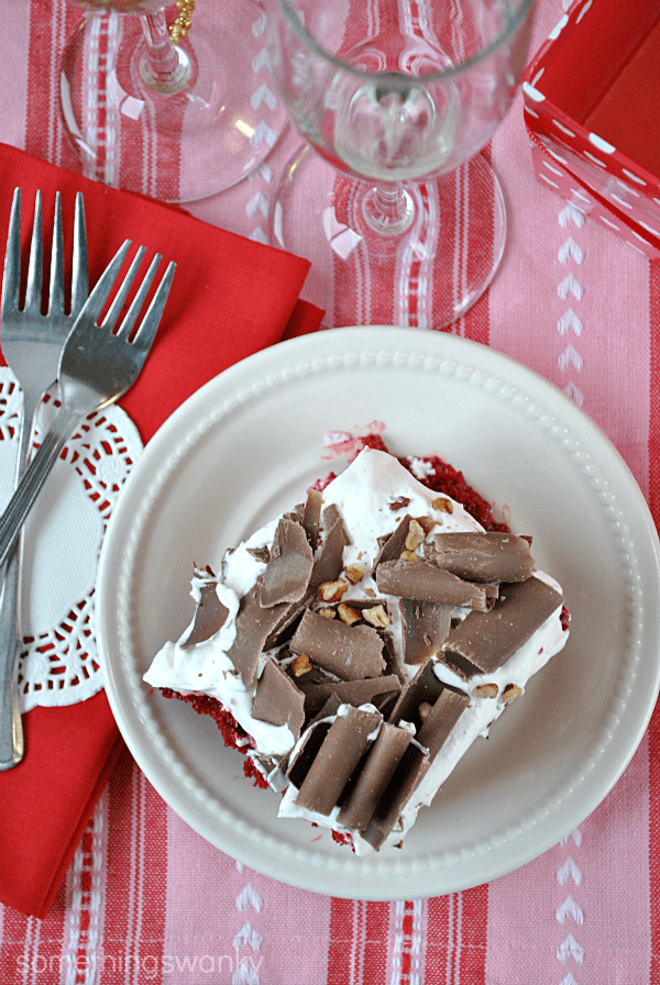 Better Than Valentine’s Day… Red Velvet Poke Cake Recipe posted by Something Swanky Pin Share Tweet Email Jump to Recipe SomethingSwanky is reader-supported. When you buy through links on our site, we may earn an affiliate commission at no extra cost to you. I’m sure you knew this was coming. Between my use of Red Velvet as a Valentine’s Day crutch and my recently developed obsession with poke cakes, this was really always part of the plan, right? But don’t wave it off already! Just like my Christmas Poke Cake, there’s a little more to this one than meets the eye. Yes, yes. It’s saturated in a copious amount of sweetened condensed milk. Yes, it has a whipped topping. And the chocolate and chopped pecans on top aren’t really much of a surprise either, are they? But what you can’t detect just by looking at this cake is that it has some seriousΒ Cinnabon flavoring to it! I’ve been looking for a way to incorporate International Delight’s Cinnabon Creamer into a dessert. Because it is completely divine. I’ve been drinking it in my hot chocolate alllllllll winter. Just open the top and take a whiff– it’s like you’re actually walking into a Cinnabon store! And isn’t their smell the best part? (well, almost) Anyway. The creamer doesn’t really have a very strong cinnamon-y taste, so I was having a hard time thinking of ways to use it. Because my mind naturally wanted to take it to a cinnamon-y place. And then it occurred to me: the reason it doesn’t taste like cinnamon is because it tastes like cinnamon roll FROSTING. Which we all know is in a class of it’s own, right?! And I wanted this cake to have that cream cheese flavor to it, since cream cheese and red velvet are a classic pairing, but I couldn’t find a great place to incorporate actual cream cheese without messing up the texture. Β The Cinnabon creamer ended up being a perfect solution, and I love how the flavor turned out! Eat up! Continue to Content Better Than Valentineβs Dayβ¦ Red Velvet Poke Cake Print Ingredients 9x13 Red Velvet Cake, baked and cooled 1 - 14.5 oz can sweetened condensed milk 1 cup International Delight Cinnabon creamer, divided 1 - 10.6 oz tub Vanilla Cool Whip Frosting 1 - 8 oz Cool Whip Optional toppings: chocolate shavings and chopped pecans Instructions Use the bottom of a wooden spoon to poke approximately 20 holes evenly over the cake. Whisk together the sweetened condensed milk and 1/2 cup of the creamer. Pour the mixture evenly over the cake, trying to fill the holes as much as possible. In a large bowl, whisk together the cool whip frosting, the cool whip, and the remaining creamer. Spread over top of the cake. Top with chocolate shavings and chopped pecans (amount varies according to preference). Chill for 4-6 hours, overnight is best. Serves 12. Notes about this recipe: My method for making chocolate curls: I took one whole block of almond bark and microwaved it in the package for 20 seconds. Remove from the package and scrape a vegetable peeler down the side of the block. I only went about halfway down the block– otherwise my peeler would break the curl. I found the middle of the block to be the softest, so that’s where I had the best curls. I used a Duncan Hines boxed cake mix for my red velvet cake. A red velvet cake made from scratch would work perfectly too! My favorite from-scratch recipe for red velvet (isn’t on the blog yet!) is by Cake Man Raven. If you google “Cake Man Raven + Red Velvet cake Recipe,” you should be able to find it. Poke Cake from Friends: Gingerbread Butterscotch Better Than… Cake by Crazy For Crust Better Than Anything Oreo Poke Cake by Chef in Training Better Than Anything Cake by Chef in Training