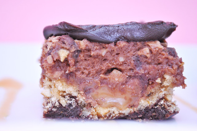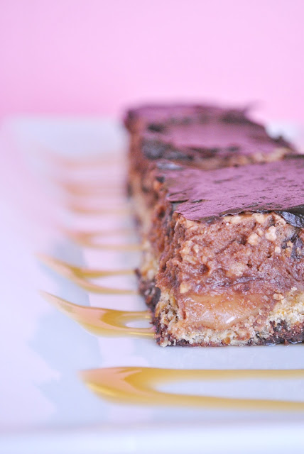 Caramel Pretzel Ooey Gooey Bars posted by Something Swanky Pin Share Tweet Email Jump to Recipe SomethingSwanky is reader-supported. When you buy through links on our site, we may earn an affiliate commission at no extra cost to you. There are a lot of perks to being a dessert blogger. Some of them being: A) You can make cookies every single day, and when people look at you funny, you can just say “oh, it’s ok. I’m a dessert blogger. It’s my job.” B) You’re never out of chocolate chips. Never. Because that would be a complete and total disaster. So you’ve always got at least 3 bags (of each kind) on hand. C) When people start to judge you for having 17 different dessert Pin Boards, they can just check out the link to your blog in your profile, and then they’re all like “ohhhhhhh, ok. That makes sense.” Here’s what’s not awesome about being a dessert blogger: Crazy high expectations. Anytime you go anywhere with a dessert. I will never be able to just “pick something up” on my way to any social gathering ever again. (Not that I’d actually want to. But that’s part of the problem…) Plus, when you bring a dessert somewhere, people expect to see the dessert you photographed, not the actual dessert. And there is a difference. I mean, not huge differences. It’s not like I’m not baking one thing and photographing another! But I will admit to strategic photographing where I can. Like these Ooey Gooey Bars. I really wanted to be able to show off all the yummy layers in these bars. So I worked really hard to get a perfectly lit side shot so that you could see the chocolate crust, the pretzel layer, the caramel oozing out, the gooey cream cheese layer, and the fudgy frosting layer up top. Looks yummy, right? (it totally is) But when I took these to a family reunion, and angels didn’t start singing when the tupperware lid snapped off to reveal a pile of unevenly-cut, chocolate-looking somethings that had clearly suffered some damage from the heat in an unfortunately timed the-air-conditioner-in-car-went-out ordeal… it was quite anti-climatic. And that is the curse of being a dessert blogger. Although, on second though, the consolation prize is all that dessert… So I guess it’s not that bad 🙂 Continue to Content Caramel Pretzel Ooey Gooey Bars Print Ingredients For the Cake Crust: 1 chocolate cake mix 1 egg 8 tbsp. butter For the Caramel Pretzel Layer: 1 1/2 c. crushed pretzels 2 tbsp. sugar 3 tbsp. butter, melted Approximately 1 dozen Rolos, unwrapped For the Gooey Layer: 1 - 8 oz. package Philadelphia Chocolate Indulgence Cream Cheese 2 eggs 1 teaspoon vanilla 8 tablespoons butter, melted 1 16-ounce box powdered sugar Topping: Optional: Chocolate Fudge Frosting Instructions Combine the cake mix, butter, and egg in a medium bowl. Press evenly into the bottom of a well greased and lined 9x13 baking dish. Mix the pretzels, sugar, and melted butter in a bowl. Spread the pretzel mixture over the cake layer. Press the rolos into the pretzels, evenly distributed. In a stand mixer (or with an electric mixer) whisk the cream cheese until smooth. Add the eggs, vanilla, and butter. Gradually mix in the powdered sugar until smooth. Spread over the pretzel layer. Bake at 350º for 40-50 minutes, until just set in the middle. But don't overbake! You want it to be gooey in the middle. Optional: spread chocolate frosting over the top of the cooled bars. Recommend serving chilled! Please visit my Party Page for a more complete index of Link Parties.
