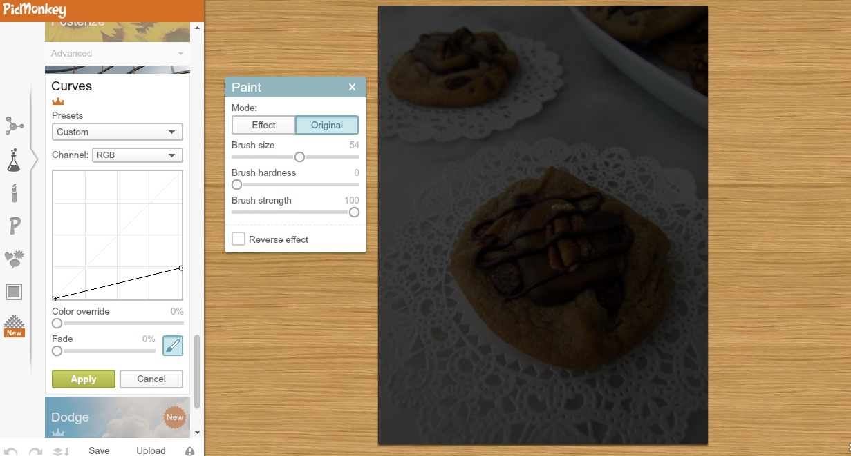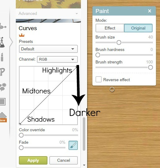 I came here b/c I did a google search to find out how to use curves so thank you for the help! And since I do know what the “paint” diaglog box is about, I hope I can help you in return. Whenever you use an edit and that box comes up, that means you can both erase and add back in (in case you erase too much) of the edit you just did. So like if you used the black and white edit but still wanted color in one part of the picture, you would click on the eraser in the dialog box, select your brush size, and erase the black and white to reveal the color on the spot you want. If you erase too much and some color shows around the edges, you can zoom in and select the paintbrush, make the brush size smaller, and paint back in the affect in the places you want it. I use it all the time!! If I add a sticker of my own that has a background on top of my image, I’ll just erase the background to make it look like a sticker I nabbed straight off the Picmonkey stickers. It’s super cool. Reply
