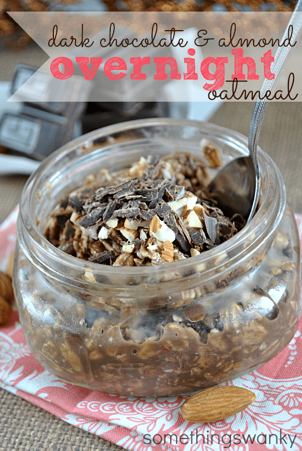Dark Chocolate & Almond Overnight Oats Recipe posted by Something Swanky Pin Share Tweet Email Jump to Recipe SomethingSwanky is reader-supported. When you buy through links on our site, we may earn an affiliate commission at no extra cost to you. So here’s what I know about uncooked oatmeal: it’s supposed to be a lot better for you than cooked oatmeal. And that’s about the extent of my official medical/health knowledge on the subject. Impressive, I know. But in all seriousness, I have some friends who I am very confident have thoroughly researched the matter and they highly recommend incorporating uncooked oats into your daily diet as a means of (most effectively) lowering (or maintaining) your cholesterol. And I can say that I’ve had some of my own experience in achieving greater health benefits by regularly eating uncooked oats. Last summer I was going through some sort of weird gastrointestinal issue (it’s okay, this won’t be as gross as it sounds!).ย If I ate anything high in fat (including healthy fats like peanut butter and avocado in small servings), I experienced this really horrible pain that wrapped from the right side of my abdomen around to the right side of my back. I thought for sure it was a gallbladder complication. After some internet research and talking to friends, I found that eating uncooked oatmeal was highly recommended as a non-medicinal way to alleviate gastrointestinal discomfort. Admittedly, I also made some other changes in my life– like running almost daily and improving my overall diet in general. But I give a lot of the credit to those oats! Last summer, I ate the oatmeal like cereal. I just poured cold milk over top and ate them plain (obviously, I was in some pretty serious pain, because I definitely don’t like my food that bland!). But recently, my husband and I have been eating this sweeter version of uncooked oats! If you’re on Pinterest, I’m sure you’ve seen 18 gajillion billion recipes for overnight oats. And here’s one more for the pile. Although, I will say this about these oats: they really do taste like dessert. And with NONE of the guilt! This is one recipe on Something Swanky that isn’t just not bad for you– it’s actually GOOD for you. Here’s a double bonus: I caught my husband telling my mom how much he loved these. And my husband is SO over the complimenting-every-dessert-I-make stage. When he says he likes it, that means it’s GOOD. Continue to Content Dark Chocolate & Almond Overnight Oats Print Ingredients 1/2 cup old fashioned oats 1/2 cup + a little extra* Dark Chocolate Almond or Soy Milk (I use Almond Breeze) 1 tbsp. chopped dark chocolate 1 tbsp. chopped raw almonds Instructions Mix all ingredients in a container that can be covered and sealed (I recommend a mason jar or tupperware). Let chill in refrigerator overnight. Oats should be softened by morning and ready to eat! Serves 1 Notes about this Recipe: I’m sure you can also use dairy chocolate milk. I haven’t tried it myself, but I can’t imagine why it wouldn’t work! In the ingredients, I specify that you should use 1/2 cup chocolate almond milk + a little extra. I’ve found that I need another splash or two of milk to get the consistency just the way I like it. This isn’t an exact science, you can easily add a little more or less milk depending on the results you want to get. And maybe you’ll have to try it a couple of times to find exactly the way you like yours! I try to make sure ALL of the oats are moistened (benefit of using a clear container), and then add just a little more for them to soak up overnight. I’ve made a rocky road version of this by adding a tablespoon of marshmallows. My husband loved it, but I wasn’t crazy about the texture of the marshmallows.ย I’ve also whisked a teaspoon of peanut butter into the milk before pouring over the oats– that was splendid ๐ Oatmeal from Friends: Banana Breakfast Cookies by Crazy For Crust Cinnamon Roll Oatmeal by Cooking Classy Oatmeal Smoothies by The Yummy Life