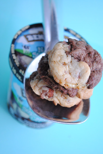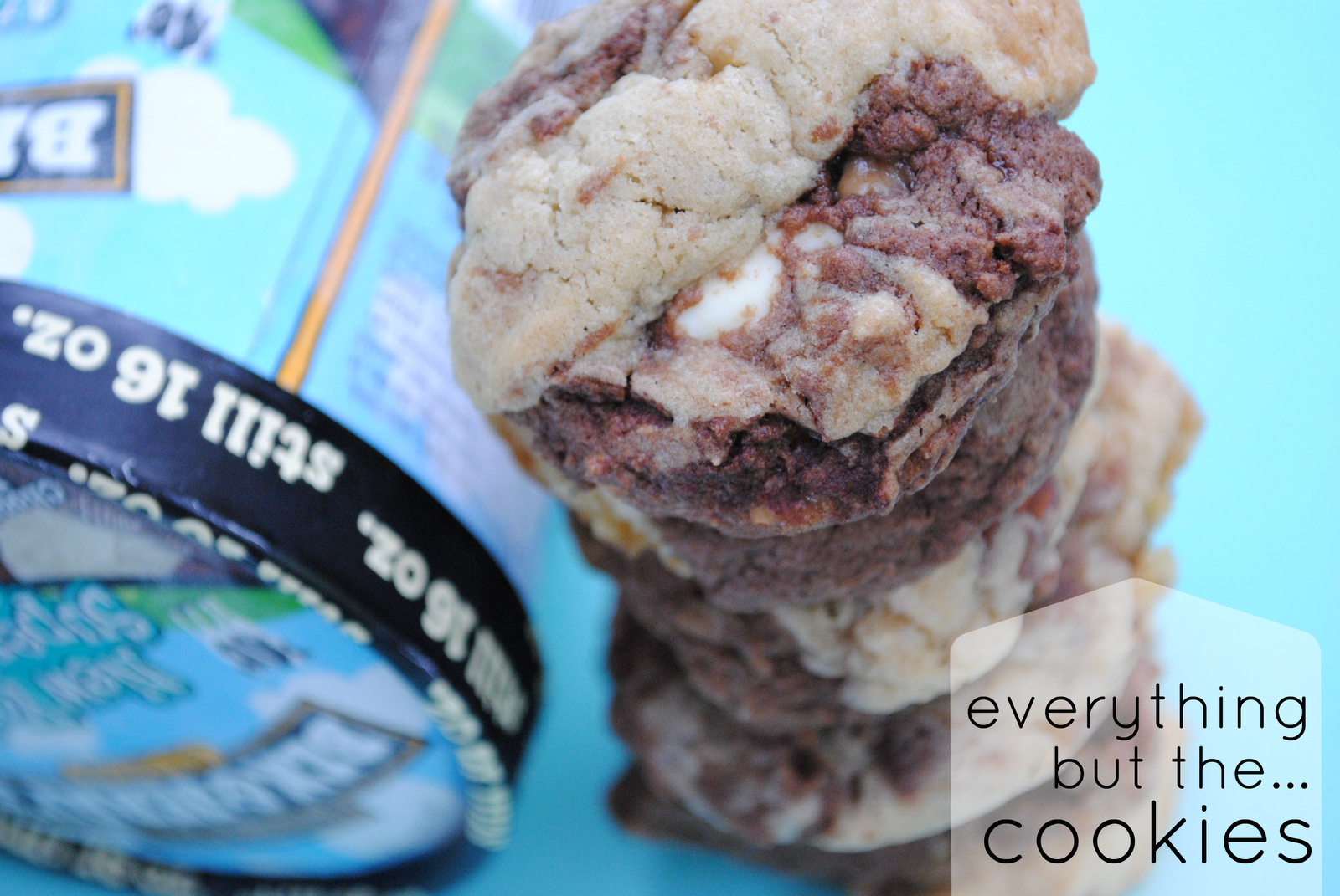 Everything But The… Cookies posted by Something Swanky Pin Share Tweet Email SomethingSwanky is reader-supported. When you buy through links on our site, we may earn an affiliate commission at no extra cost to you. These cookies are inspired by an epic Ben and Jerry’s ice cream flavor. My favorite flavor: Everything But The… It’s always the logical answer to the great freezer aisle dilema: Peanut Butter Cup or Toffee Crunch? Chocolate or Vanilla? White Chocolate Chunks or Chocolate Covered Almonds? You don’t have to choose! It’s all in that one little carton. Brilliance if I’ve ever seen it. And now you can enjoy all those flavors in a cookie. …perhaps even a la mode? Everything But The… Cookies 6024457 Ingredients (approx. 4 dozen) 1/2 c butter 1/2 c shortening 1 c brown sugar 1/2 c sugar 1/2 tsp baking soda 2 eggs 1 tsp vanilla 2 1/2 c flour 1/4 c cocoa powder 1/2 c white chocolate chunks (I just chopped up Hershey Bars, but you could also use chocolate chips) 1/2 c chocolate covered almonds 1/2 c heath bits 1/2 c reese’s peanut butter cups (minis) Instructions Using a paddle attachment in a stand mixer, mix together the butter, shortening, brown sugar, sugar, baking soda, eggs, vanilla, and flour. Add in the white chocolate chunks, chocolate covered almonds, peanut butter cups, and heath bits. Scrape half the dough into a medium bowl and set aside. Add the cocoa powder to the dough left in the stand mixer bowl and mix well. Fill a cookie scoop halfway with the chocolate dough and halfway with the vanilla dough (the doughs will mix some, which is fine) and release the dough onto a parchment lined cookie sheet. Bake at 375º for 9 minutes. Let cool on the pan. Powered by Recipage Please visit my Party Page for a more complete index of Link Parties. If you host a regular link party, please add it to my Party Page!
