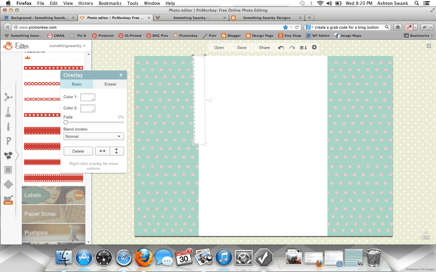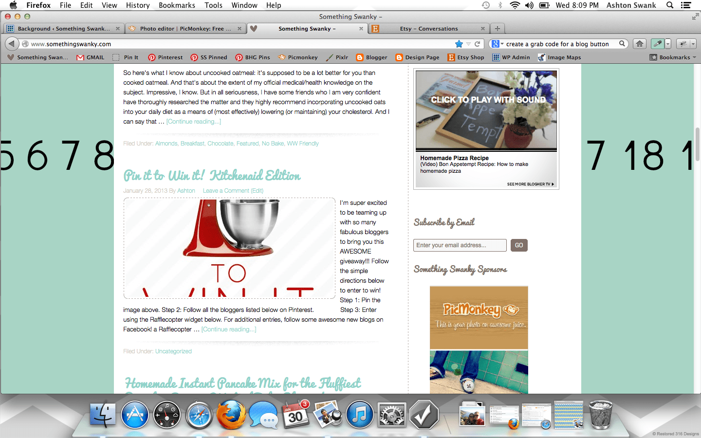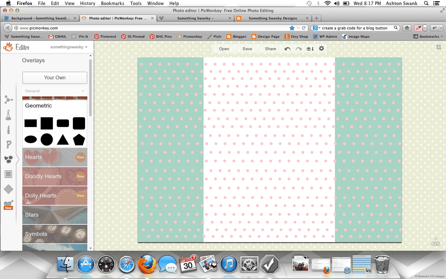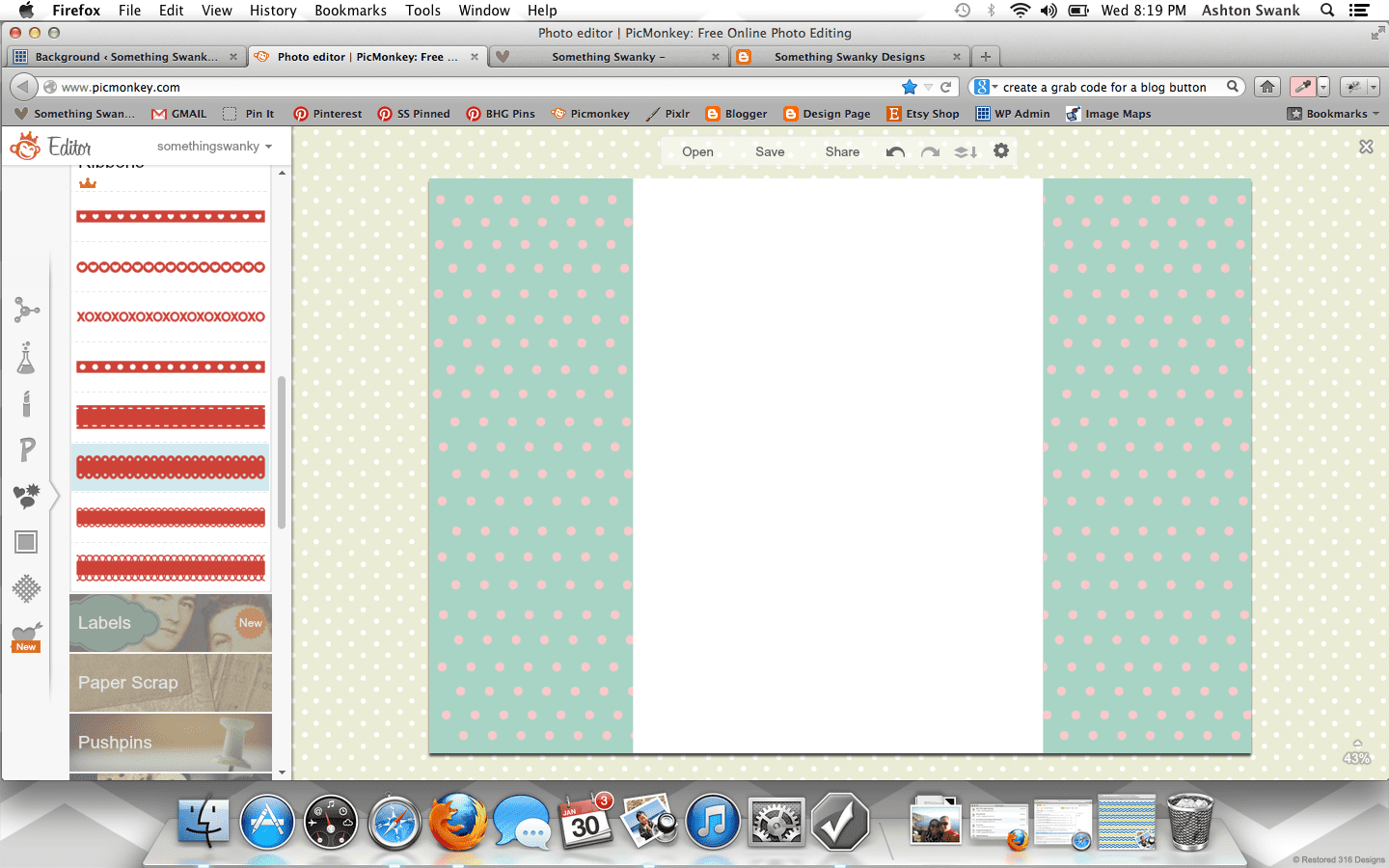 How to Create a Custom Blog Background in Picmonkey posted by Something Swanky Pin Share Tweet Email SomethingSwanky is reader-supported. When you buy through links on our site, we may earn an affiliate commission at no extra cost to you. I’ve received numerous requests to put together a tutorial on backgrounds, so today’s the day! Here’s the deal with blog backgrounds: they are super, duper, crazy important. Why? Don’t I always say that the header is most important? That it’s what people see first? Ok, yes. The header is first and foremost. But NOTHING messes up a good header like an awful background. And a background can be awful in all sorts of ways… If you’re a blogger, I’m sure you’ve found yourself guilty of one of these background grievances as some point or another (or even now!): You have a cute background from a site that provides free backgrounds! Their watermark image is on your blog. Oh, and 15 million other people also have that background. Not good. You are using a Blogger or WP provided background. Not good. You attempted a custom background, but you were too afraid to mess around with any other settings. So you have an overlapping or squished sidebar/header. Not good. You have no background. (This actually isn’t the worst scenario in the world… but why settle?!) I have done ALL OF THESE THINGS! Which is why I’m bold enough to list them. I promise– this isn’t me being mean if you have one of those background situations. This is me saying, “it doesn’t have to be that way!” You can have a gorgeous, custom background that looks exactly the way you want it to look! It’s not even hard!! At the worst, it could be a little time consuming– but that all depends on what you make of it ๐ . Time to get started! For basics on using Picmonkey, see this post first. Step 1: Open Picmonkey.com and proceed to white wash any photo and re-size it to approximately 2000 pixels x 1400 pixels. Don’t forget to merge your layers using the icon that looks like this: Step 2: Since our background is nothing more than an image that will display “behind” the blog, I like to create mine with a white center. It helps me to better see the parameters of the blog and allows me to add cute borders! So to create the white center, add the left and right sides using the rectangle overlay. Go ahead and adjust the color to your primary color. Ok… everyone may find they have a different method here. You can get all mathematical and actually calculate how many pixels each one of these parts should be according the overall width of your blog (if you want to do that, here’s a cheat sheet help: I use the crop tool to measure different part of the image. So click on crop, like you’re going to crop something. It will show you the dimensions of selected areas. Just use that to measure and make adjustments, and then hit cancel instead of cropping). BUT– that’s not how I do this part. I like to eyeball it. Simply because, in my experience… my calculations never work. And I just got sick of the logical method failing me every time, so I switched over to eyeballing it. Don’t worry, there is a LITTLE technique to it so that it’s not just total guess work ๐ And once you’ve done this part the first time, you can just use this image as a template for any future backgrounds! So…. Step 3: Use the text tool to number across the image (sort of like a football field). It can go anywhere on the image, mine is shown at the bottom here: Step 4: Save the image to your desktop and upload it as your background image in a new tab or window (if you have a high traffic blog, you may want to wait until night time or a low traffic day to install your background so people don’t see the “measuring” background. Or… you can just not care, like me, since it only takes a few minutes ๐ ) DO NOT EXIT OUT OF YOUR IMAGE ON PICMONKEY! YOU WILL BE RETURNING TO EDIT THE IMAGE! Instructions to install on blogger: Dashboard >> Template (I like the white Simple template) >> Customize Background >> click on the downward arrow beside the sample square >> upload image Proceed to upload the image and save Instructions to install on WP (.com or self hosted): Dashboard >> Appearance >> Background Find “select image” >> Browse (select the file from your desktop) >> Upload (you may need to remove a default background here) Under “display options” be sure to select center, tile vertically, and fixed **Don’t be scared if it looks super skinny in the preview– it’ll be okay. Step 5: Check it out on your blog– odds are, it’s not going to fit just right quite yet. See how my header and body section are hanging off the sides of my center section? So I scroll down to my numbers to see where the “true” edges of my blog are… So here, I can see the left edge lines up with the 8 and that the right edge covers up the 1 in the 17. Awesome, now I know exactly where I need to work. So I go back to my Picmonkey image (that I DID NOT exit out of) to make my edits. Step 6: Make the necessary changes to the center section (widening or shrinking it as necessary, using the numbers as a guide). Once the widths are correct, delete the numbers and proceed to “decorate” the background. Right now, I like polka dots. Chevron is pretty awesome too– there’s so much you can do if you just take the time to play around with the overlays in Picmonkey. Also– don’t worry about the designs going over the white part in the center– we’ll get to that. The easiest way to get straight polka dots is to create a row of periods (I put a space between each one), then duplicate the text for each new line. Notice that my dots are pretty small here compared to how they look on my blog– plan for your images to be larger on your blog than they appear when editing. Step 7: Add a new white rectangle layover. Match it to the exact size as the center section and cover up any designs that may be in the mi