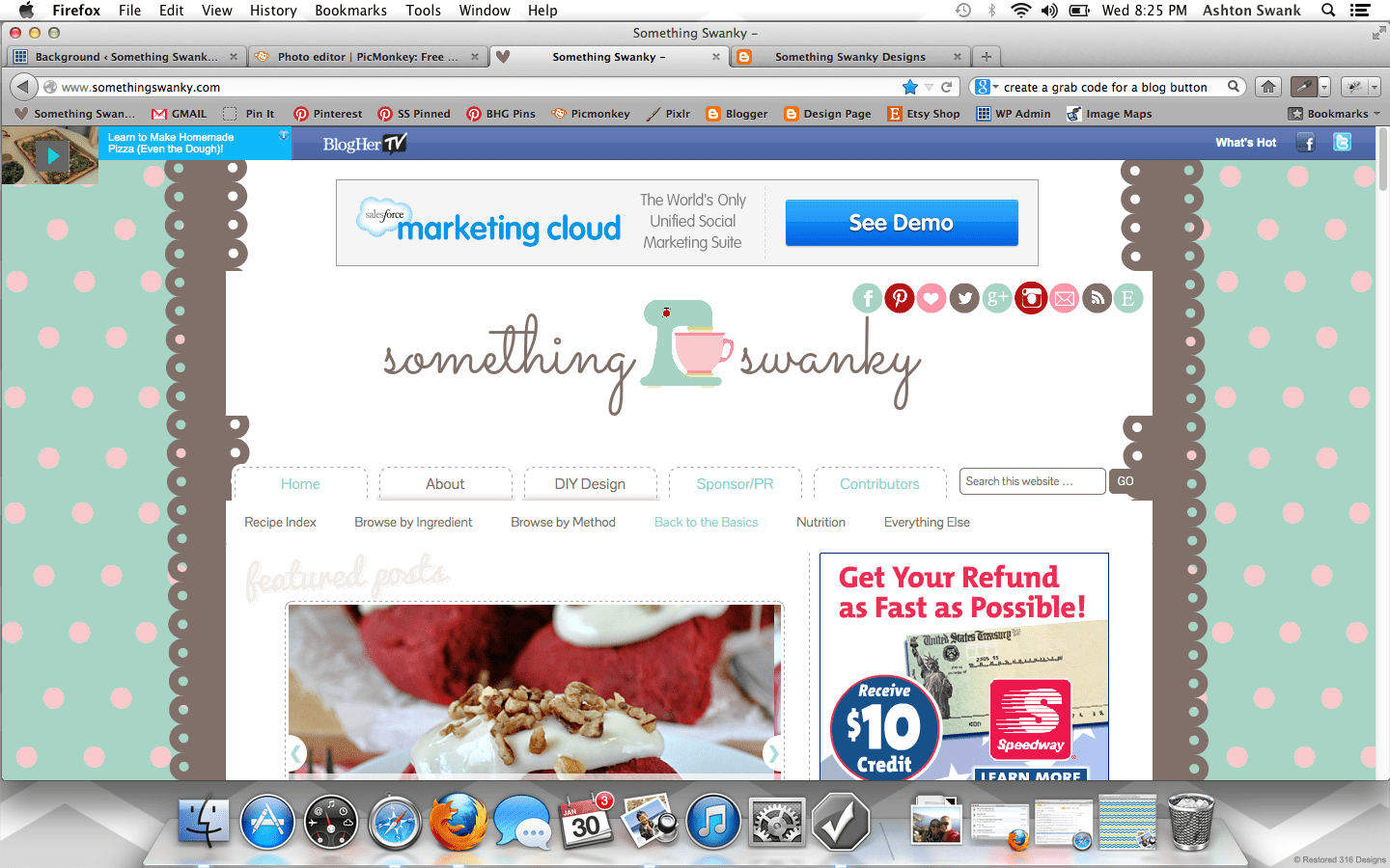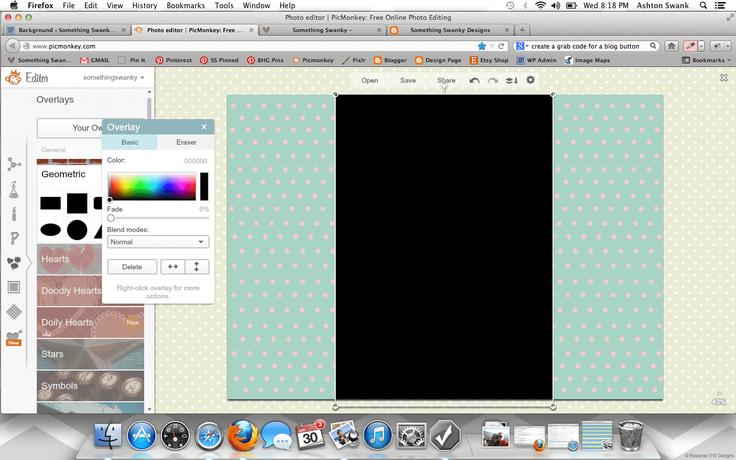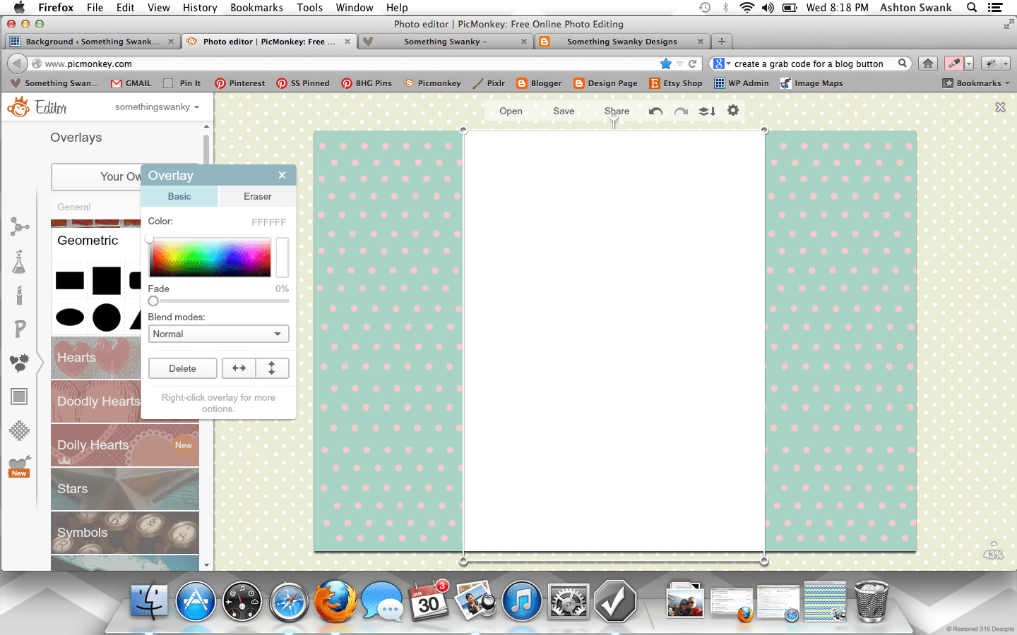 How to Create a Custom Blog Background in Picmonkey posted by Something Swanky Pin Share Tweet Email SomethingSwanky is reader-supported. When you buy through links on our site, we may earn an affiliate commission at no extra cost to you. I’ve received numerous requests to put together a tutorial on backgrounds, so today’s the day! Here’s the deal with blog backgrounds: they are super, duper, crazy important. Why? Don’t I always say that the header is most important? That it’s what people see first? Ok, yes. The header is first and foremost. But NOTHING messes up a good header like an awful background. And a background can be awful in all sorts of ways… If you’re a blogger, I’m sure you’ve found yourself guilty of one of these background grievances as some point or another (or even now!): You have a cute background from a site that provides free backgrounds! Their watermark image is on your blog. Oh, and 15 million other people also have that background. Not good. You are using a Blogger or WP provided background. Not good. You attempted a custom background, but you were too afraid to mess around with any other settings. So you have an overlapping or squished sidebar/header. Not good. You have no background. (This actually isn’t the worst scenario in the world… but why settle?!) I have done ALL OF THESE THINGS! Which is why I’m bold enough to list them. I promise– this isn’t me being mean if you have one of those background situations. This is me saying, “it doesn’t have to be that way!” You can have a gorgeous, custom background that looks exactly the way you want it to look! It’s not even hard!! At the worst, it could be a little time consuming– but that all depends on what you make of it ๐ . Time to get started! For basics on using Picmonkey, see this post first. Step 1: Open Picmonkey.com and proceed to white wash any photo and re-size it to approximately 2000 pixels x 1400 pixels. Don’t forget to merge your layers using the icon that looks like this: Step 2: Since our background is nothing more than an image that will display “behind” the blog, I like to create mine with a white center. It helps me to better see the parameters of the blog and allows me to add cute borders! So to create the white center, add the left and right sides using the rectangle overlay. Go ahead and adjust the color to your primary color. Ok… everyone may find they have a different method here. You can get all mathematical and actually calculate how many pixels each one of these parts should be according the overall width of your blog (if you want to do that, here’s a cheat sheet help: I use the crop tool to measure different part of the image. So click on crop, like you’re going to crop something. It will show you the dimensions of selected areas. Just use that to measure and make adjustments, and then hit cancel instead of cropping). BUT– that’s not how I do this part. I like to eyeball it. Simply because, in my experience… my calculations never work. And I just got sick of the logical method failing me every time, so I switched over to eyeballing it. Don’t worry, there is a LITTLE technique to it so that it’s not just total guess work ๐ And once you’ve done this part the first time, you can just use this image as a template for any future backgrounds! So…. Step 3: Use the text tool to number across the image (sort of like a football field). It can go anywhere on the image, mine is shown at the bottom here: Step 4: Save the image to your desktop and upload it as your background image in a new tab or window (if you have a high traffic blog, you may want to wait until night time or a low traffic day to install your background so people don’t see the “measuring” background. Or… you can just not care, like me, since it only takes a few minutes ๐ ) DO NOT EXIT OUT OF YOUR IMAGE ON PICMONKEY! YOU WILL BE RETURNING TO EDIT THE IMAGE! Instructions to install on blogger: Dashboard >> Template (I like the white Simple template) >> Customize Background >> click on the downward arrow beside the sample square >> upload image Proceed to upload the image and save Instructions to install on WP (.com or self hosted): Dashboard >> Appearance >> Background Find “select image” >> Browse (select the file from your desktop) >> Upload (you may need to remove a default background here) Under “display options” be sure to select center, tile vertically, and fixed **Don’t be scared if it looks super skinny in the preview– it’ll be okay. Step 5: Check it out on your blog– odds are, it’s not going to fit just right quite yet. See how my header and body section are hanging off the sides of my center section? So I scroll down to my numbers to see where the “true” edges of my blog are… So here, I can see the left edge lines up with the 8 and that the right edge covers up the 1 in the 17. Awesome, now I know exactly where I need to work. So I go back to my Picmonkey image (that I DID NOT exit out of) to make my edits. Step 6: Make the necessary changes to the center section (widening or shrinking it as necessary, using the numbers as a guide). Once the widths are correct, delete the numbers and proceed to “decorate” the background. Right now, I like polka dots. Chevron is pretty awesome too– there’s so much you can do if you just take the time to play around with the overlays in Picmonkey. Also– don’t worry about the designs going over the white part in the center– we’ll get to that. The easiest way to get straight polka dots is to create a row of periods (I put a space between each one), then duplicate the text for each new line. Notice that my dots are pretty small here compared to how they look on my blog– plan for your images to be larger on your blog than they appear when editing. Step 7: Add a new white rectangle layover. Match it to the exact size as the center section and cover up any designs that may be in the mi