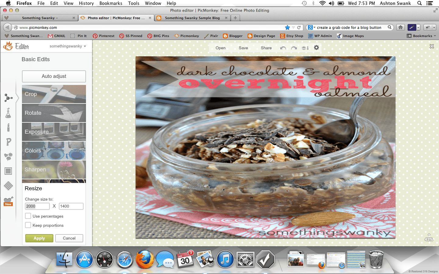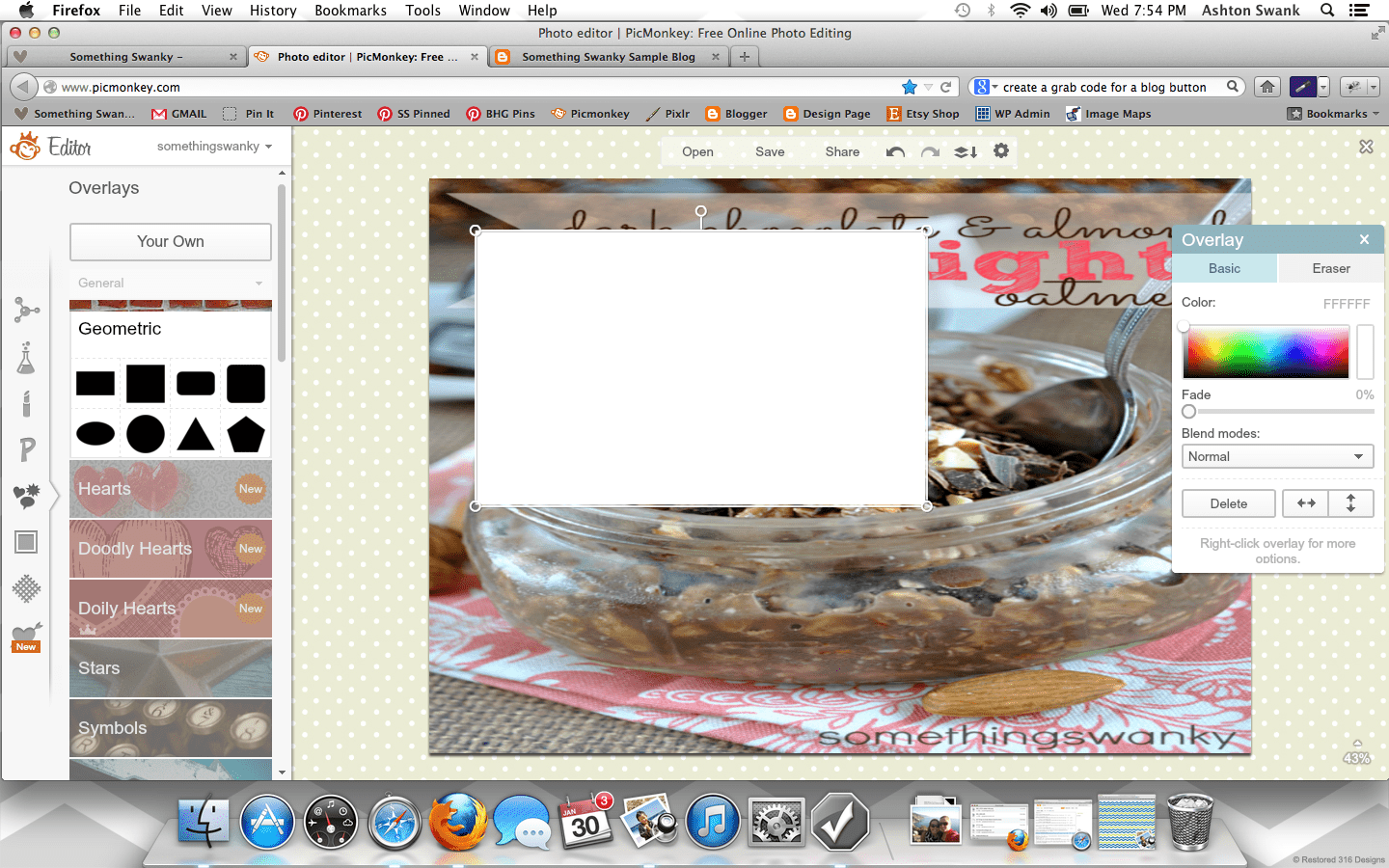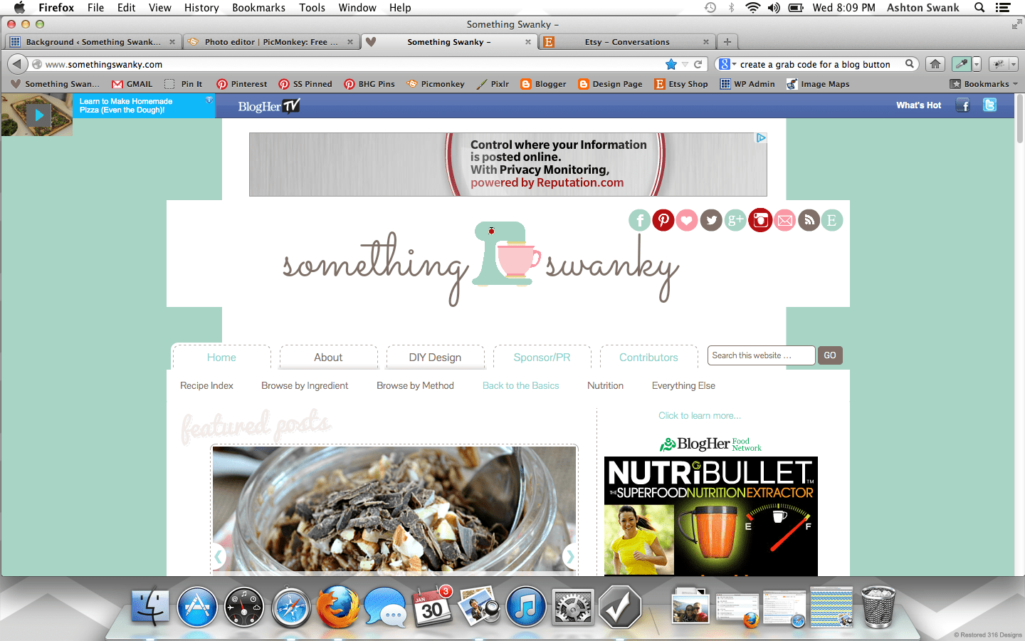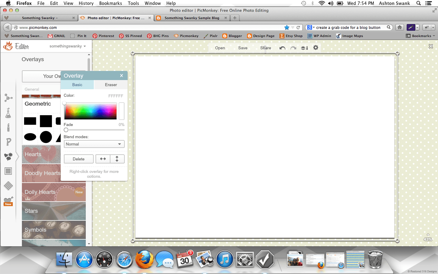 How to Create a Custom Blog Background in Picmonkey posted by Something Swanky Pin Share Tweet Email SomethingSwanky is reader-supported. When you buy through links on our site, we may earn an affiliate commission at no extra cost to you. I’ve received numerous requests to put together a tutorial on backgrounds, so today’s the day! Here’s the deal with blog backgrounds: they are super, duper, crazy important. Why? Don’t I always say that the header is most important? That it’s what people see first? Ok, yes. The header is first and foremost. But NOTHING messes up a good header like an awful background. And a background can be awful in all sorts of ways… If you’re a blogger, I’m sure you’ve found yourself guilty of one of these background grievances as some point or another (or even now!): You have a cute background from a site that provides free backgrounds! Their watermark image is on your blog. Oh, and 15 million other people also have that background. Not good. You are using a Blogger or WP provided background. Not good. You attempted a custom background, but you were too afraid to mess around with any other settings. So you have an overlapping or squished sidebar/header. Not good. You have no background. (This actually isn’t the worst scenario in the world… but why settle?!) I have done ALL OF THESE THINGS! Which is why I’m bold enough to list them. I promise– this isn’t me being mean if you have one of those background situations. This is me saying, “it doesn’t have to be that way!” You can have a gorgeous, custom background that looks exactly the way you want it to look! It’s not even hard!! At the worst, it could be a little time consuming– but that all depends on what you make of it ๐ . Time to get started! For basics on using Picmonkey, see this post first. Step 1: Open Picmonkey.com and proceed to white wash any photo and re-size it to approximately 2000 pixels x 1400 pixels. Don’t forget to merge your layers using the icon that looks like this: Step 2: Since our background is nothing more than an image that will display “behind” the blog, I like to create mine with a white center. It helps me to better see the parameters of the blog and allows me to add cute borders! So to create the white center, add the left and right sides using the rectangle overlay. Go ahead and adjust the color to your primary color. Ok… everyone may find they have a different method here. You can get all mathematical and actually calculate how many pixels each one of these parts should be according the overall width of your blog (if you want to do that, here’s a cheat sheet help: I use the crop tool to measure different part of the image. So click on crop, like you’re going to crop something. It will show you the dimensions of selected areas. Just use that to measure and make adjustments, and then hit cancel instead of cropping). BUT– that’s not how I do this part. I like to eyeball it. Simply because, in my experience… my calculations never work. And I just got sick of the logical method failing me every time, so I switched over to eyeballing it. Don’t worry, there is a LITTLE technique to it so that it’s not just total guess work ๐ And once you’ve done this part the first time, you can just use this image as a template for any future backgrounds! So…. Step 3: Use the text tool to number across the image (sort of like a football field). It can go anywhere on the image, mine is shown at the bottom here: Step 4: Save the image to your desktop and upload it as your background image in a new tab or window (if you have a high traffic blog, you may want to wait until night time or a low traffic day to install your background so people don’t see the “measuring” background. Or… you can just not care, like me, since it only takes a few minutes ๐ ) DO NOT EXIT OUT OF YOUR IMAGE ON PICMONKEY! YOU WILL BE RETURNING TO EDIT THE IMAGE! Instructions to install on blogger: Dashboard >> Template (I like the white Simple template) >> Customize Background >> click on the downward arrow beside the sample square >> upload image Proceed to upload the image and save Instructions to install on WP (.com or self hosted): Dashboard >> Appearance >> Background Find “select image” >> Browse (select the file from your desktop) >> Upload (you may need to remove a default background here) Under “display options” be sure to select center, tile vertically, and fixed **Don’t be scared if it looks super skinny in the preview– it’ll be okay. Step 5: Check it out on your blog– odds are, it’s not going to fit just right quite yet. See how my header and body section are hanging off the sides of my center section? So I scroll down to my numbers to see where the “true” edges of my blog are… So here, I can see the left edge lines up with the 8 and that the right edge covers up the 1 in the 17. Awesome, now I know exactly where I need to work. So I go back to my Picmonkey image (that I DID NOT exit out of) to make my edits. Step 6: Make the necessary changes to the center section (widening or shrinking it as necessary, using the numbers as a guide). Once the widths are correct, delete the numbers and proceed to “decorate” the background. Right now, I like polka dots. Chevron is pretty awesome too– there’s so much you can do if you just take the time to play around with the overlays in Picmonkey. Also– don’t worry about the designs going over the white part in the center– we’ll get to that. The easiest way to get straight polka dots is to create a row of periods (I put a space between each one), then duplicate the text for each new line. Notice that my dots are pretty small here compared to how they look on my blog– plan for your images to be larger on your blog than they appear when editing. Step 7: Add a new white rectangle layover. Match it to the exact size as the center section and cover up any designs that may be in the mi