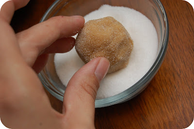 4. Roll the dough ball in sugar and place on parchment lined cookie sheet.