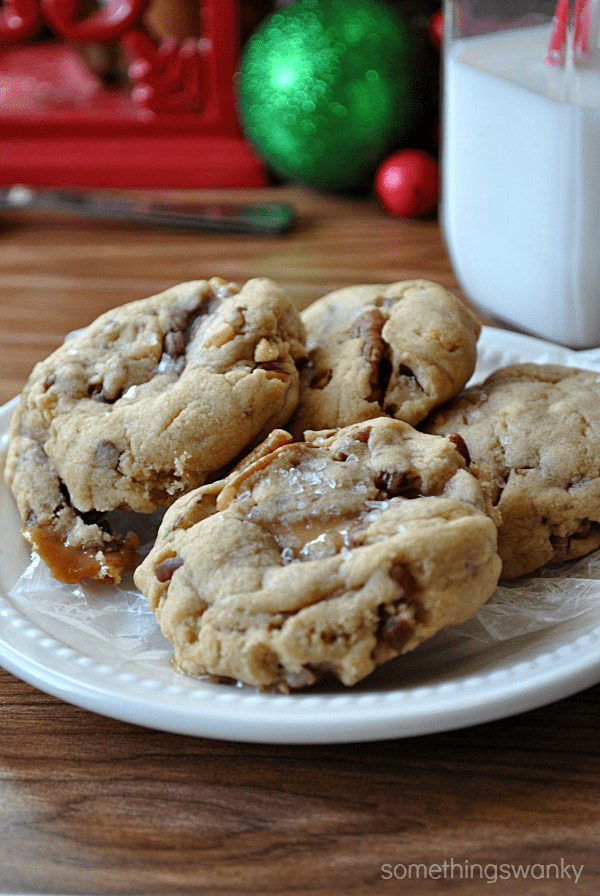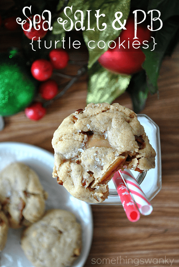 Sea Salt & Peanut Butter Turtle Cookies Recipe posted by Something Swanky Pin Share Tweet Email SomethingSwanky is reader-supported. When you buy through links on our site, we may earn an affiliate commission at no extra cost to you. As it turns out, you shouldn’t experiment with new recipes during a nationwide food blogger cookie swap. New mix ins? Those are fine. But an entirely new cookie recipe? No. No, you shouldn’t do it. I have a great standby cookie recipe. It works for chocolate chip cookies, for peanut butter cookies, for chocolate cookies– for every single cookie! It’s my all time favorite, and now I’m committed to never, ever stray again. I don’t know what came over me. A fit of sheer laziness, I think. I was flipping through one of my cookie books and saw a recipe for peanut butter cookies when the idea for this flavor combo struck. A nagging voice in the back of my mind told me just to flip a few pages over for my basic, no fail cookie recipe (don’t ask me why it’s not memorized yet…), but turning the pages seemed like such a hassle. Uh, yeah. I just said that. So I stayed on the page that required no further page turning. And my cookies crumbled to bits. As it was already the day after the latest day we were supposed to ship them out, I absolutely had to send the crumbly cookies. So I stuffed the cute little snowflake tins with paper towels and marshmallows (did you know marshmallows help cookies to keep from getting dry?), and added a few other treats to compensate for the pile of crumbs… In return, I received 3 boxes of amazing cookies (thanks ladies)! I love participating in the Great Food Blogger Cookie Swap. It’s such a fun way to connect with other bloggers and in get in the holiday mood!ย A special thanks to our hosts, the bloggers of Love & Olive Oil and The Little Kitchen. Oh, and in case you were wondering, I did go back and re-do my cookies to make sure I had the recipe just right for today’s post. You can see the difference for yourself in the photos ๐ . Sea Salt & Peanut Butter Turtle Cookies Ingredients: 1/2 c butter or margarine 1/2 c peanut butter 1 c brown sugar 1/2 c sugar 2 eggs 1 tsp vanilla 1/2 tsp baking soda 2 1/2 c flour 1 c semi sweet chocolate chips 1/2 c rolos 1/2 c pecan halves 1 tsp + extra sea salt (extra is for sprinkling on top) Instructions: Cream together the butter, peanut butter, brown sugar, and granulated sugar. Mix in the eggs, one at a time (mixing in between each one), vanilla, sea salt, and baking soda. Gradually mix in the flour. Mix in the chocolate chips, rolos, and pecan halves. Scoop dough by heaping tablespoons. If using shortening instead of butter, roll gently in between palms and flatten slightly before placing on a parchment or silicon lined baking sheet. Sprinkle the tops of the cookie dough balls with sea salt (just a small pinch for each one). Bake at 375 for 10-13 minutes, until edges are golden brown. Some caramel may ooze out. Let cool on pan before transferring to wire rack. Turtle Recipes from Friends: Turtle Brownie Pies by Crazy For Crust Turtle Tassies by The Girl Who Ate Everything Turtle Shortbread Bars by The Pint Sized Baker