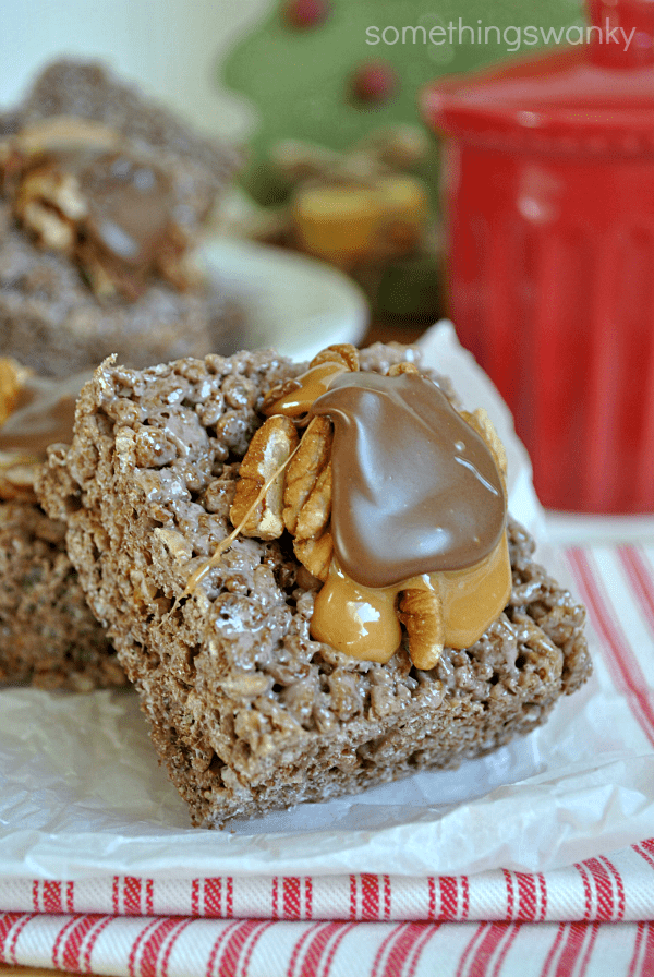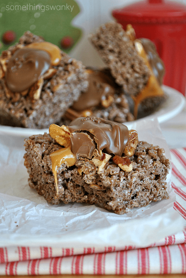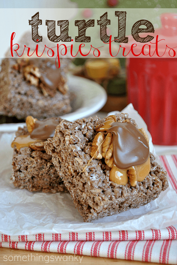 Turtle Rice Krispies Treats Recipe posted by Something Swanky Pin Share Tweet Email Jump to Recipe SomethingSwanky is reader-supported. When you buy through links on our site, we may earn an affiliate commission at no extra cost to you. As so many other bloggers have done (and are doing throughout this week) I took a “moment” of silence over the weekend in respect for the victims of the Sandy Hook shooting and the Newtown community. And now it feels so strange, foreign even, to be sitting here, staring at my picture of rice krispies treats, and wondering what I can say… Wondering how I could ever possibly segue from something to wretched to dessert. How am I supposed to pick right back up where I left off in the wake of an event so tragic? It’s hard to imagine returning to my life of recipes, photography, and Pinterest when there are so many others who will never return to the lives they had before last Friday. For one reason or another, I felt like this tragedy touched me personally. In reality, it didn’t. I don’t know know anyone who attends the school, and I’ve never met any of the victims or their families. But I do believe there is some amount of grief accompanying this event that we are each entitled to feel. Whether you feel it as the mother of your own young child or simply as a member of the human race, it’s okay to feel sorrow for these people we may not know. I guess I’m saying this, because it was a difficult realization for me to come to– that it was okay for me to really feel sorrow and grief for a tragedy not borne by me. But, in the end, I decided that having those feelings is what makes human beings so special. We can have compassion for people we’ve never met. We can have a desire to lighten their load, to carry their grief alongside of them. And that’s pretty wonderful, I think. And something that should be encouraged. On that note, I hope you saw my post about Cookies & Crafts for Sandy Hook. A group of bloggers started chatting about the shooting on Facebook. We all wanted to do something to help. The ideas started piling on top of each other, heaping really. The realization that we could use our “voices” to actually do something to help the Newtown Community was a tremendous consolation to us, and we have been anxious to get started. If you’d like to be a part of Cookies & Crafts for Sandy Hook, consider making a purchase from one of these Etsy shops on Friday, December 21. A portion or all of the proceeds from each of these shops will be donated to Newtown Youth & Family Counseling Services or a United Way fund designated specifically for this event. (Feel free to add a link to your shop to the list of you’d like to participate.) I will personally be participating on Friday by donating the profits from the first 5 blog design orders I receive on Friday, 12/21. I will post listings specifically labeled “Cookies and & Crafts for Sandy Hook” in my shop, so you can’t miss them! I’ve never sold 5 designs in one day, so I’ll admit this is sort of a lofty goal for me. But if I can get some help spreading the word, I think there’s a good chance we can do it. And, frankly, there is no proper way to segue into Rice Krispies Treats. But I will just say that these are tremendously good. I ate gobs and gobs of them, and Krispies Treats aren’t really even favorites of mine. I think the texture sold me on these– I loved biting through the chocolate and caramel up top. Seriously– a top notch dessert! Continue to Content Turtle Rice Krispies Treats Print Ingredients 3 tbsp of butter 1 - 10 oz. package of marshmallows 6-7 cups chocolate Krispies cereal (like Kellogs Cocoa Krispies) approx. 12 tbsp melted caramels approx. 12 tbsp melted chocolate appox. 12 tbsp chopped pecans Instructions In a large bowl, microwave the marshmallows and butter together for 1 minute. Remove and stir until smooth (microwave for an additional 30 seconds if needed). Mix in the cereal 3 cups at a time. Add up to an additional cup of cereal to reach desired marshmallow to cereal ratio. Press firmly into a parchment lined and greased 9x13 baking dish. Let cool and cut into 2" squares. Top each square with 1 tablespoon of chopped pecans, 1 tablespoon of melted caramel, and 1 tablespoon of melted chocolate (in that order, stacked on top of each other as pictured). Let the layers cool and harden before serving. Notes about this recipe: If you’re not so worried about presentation, you could simply drizzle the chocolate and caramel over the uncut bars, and sprinkle with the pecans. Let everything harden before cutting. Krispies from Friends: Cookie Dough Rice Krispies Treats by Steph’s Bite by Bite Cinnamon Roll Rice Krispies Treats by Cooking Classy Chocolate Peppermint Krispies Treats by Shaken Together